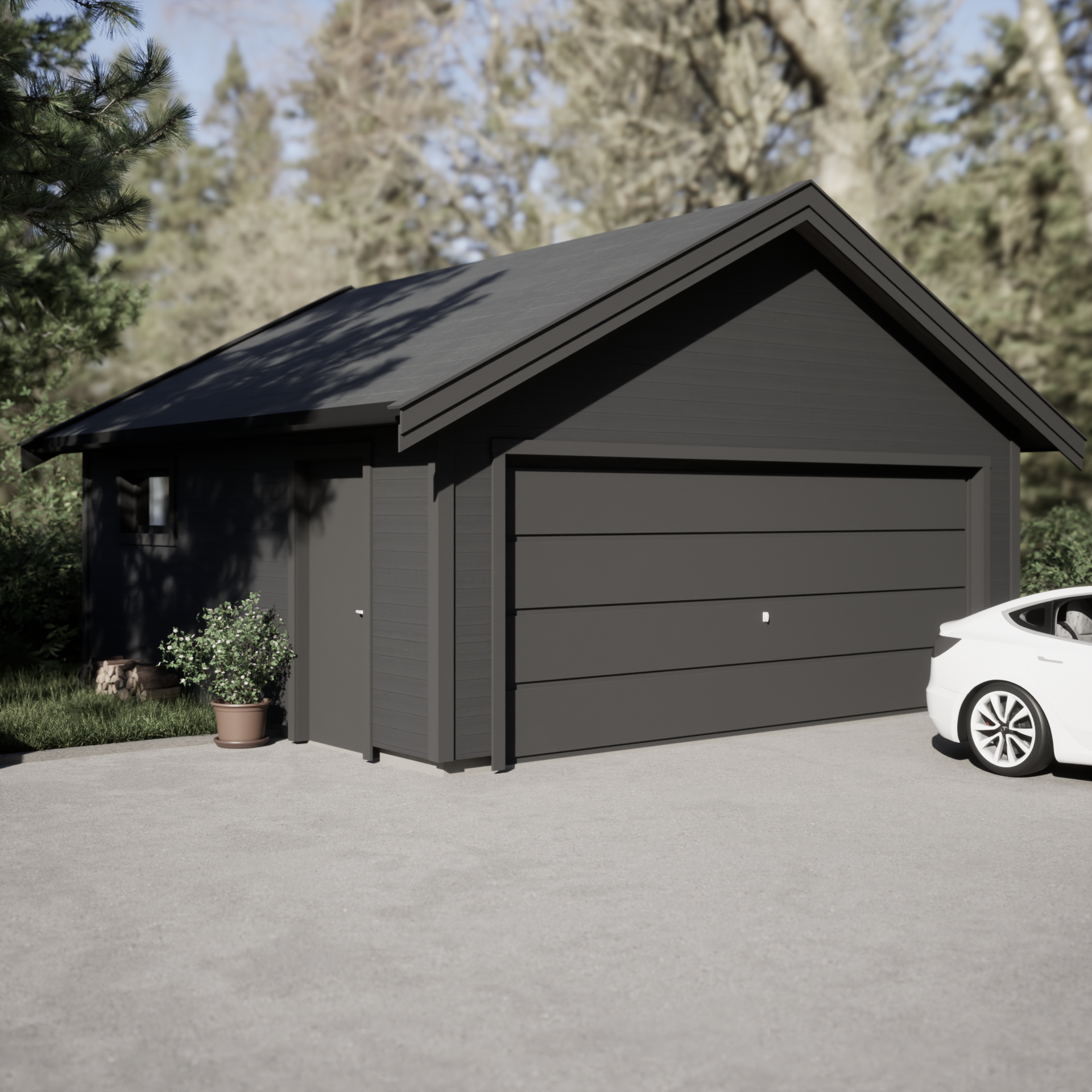 G1 er en moderne dobbeltgarasje med stående kledning.