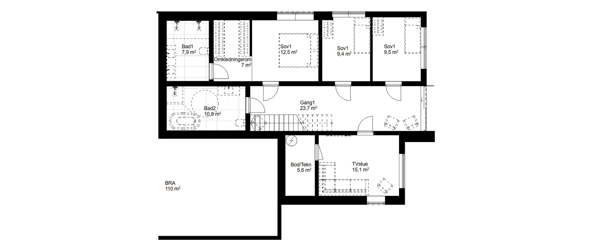 Boligen mangler sportsbod på 5 kvm, for oppfyllelse av TEK17. Dette må tilrettelegges utenfor boligen.