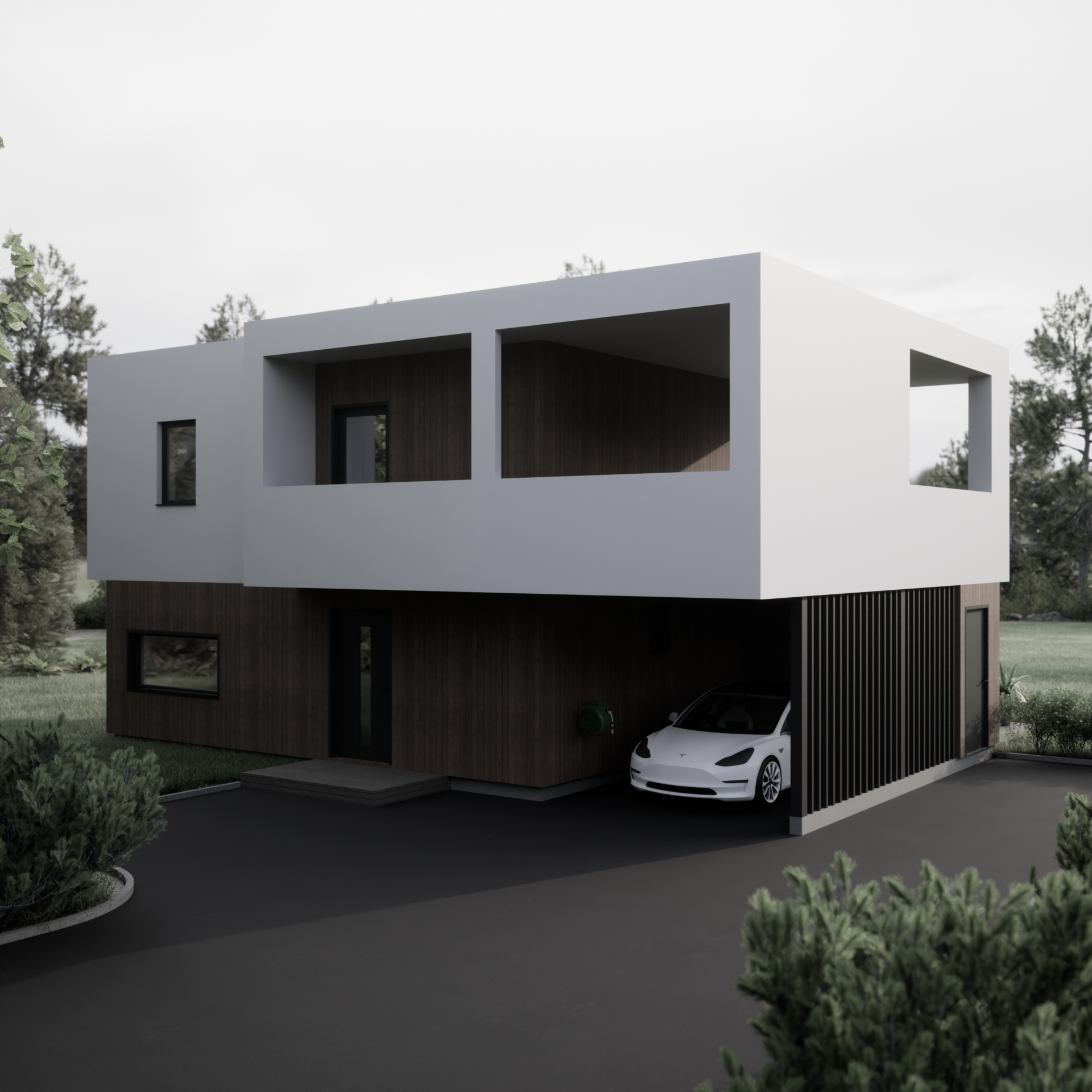 B6 er en moderne og mer påkostet utgave av B5. Boligen er en veldig kompakt 2-plans enebolig, med full takhøyde i begge etasjer. Planløsningen er utformet med praktiske og plasseffektive løsninger. Boligens fotavtrykk er svært lite. Dette gjør den aktuell for små tomter. I entre er det plass til et 0,9 m dypt garderobeskap, med plass til en teknisk unit. Har man behov for ekstra bodplass, kan man benytte plassen under trappen. Stue og kjøkken er luftig og åpent, med store vinduer. I 2. etasje finner man 3 soverom, et større bad/vaskerom og en kosekrok i enden av gangen. Her kan man sitte å kose seg, med for eksempel en god bok. I motsetning til B5 har denne boligen også en carport med sportsbod. Over carporten har man en stor overbygget balkong, hvor man kan nyte morgensol og kveldssol (litt avhengig av hvordan man plasserer boligen.